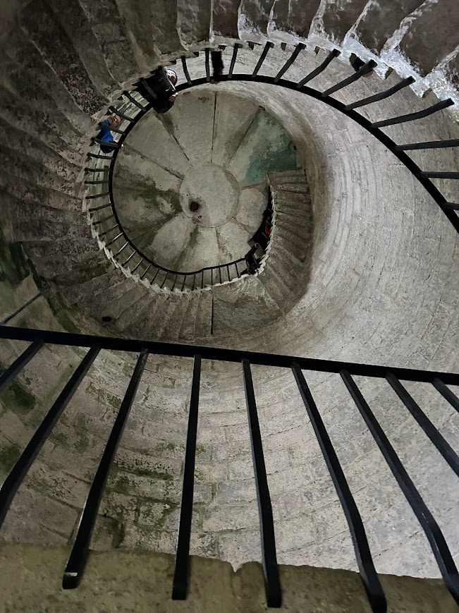 Even so we got a taste of the dramatic rock formations on the exposed north coast. We sheltered in St Helen’s church, which told the history of the island in pictures. And we spiralled the narrow granite-hewn steps in the abandoned lighthouse to the observatory tower, only to see absolutely nothing when we got there.